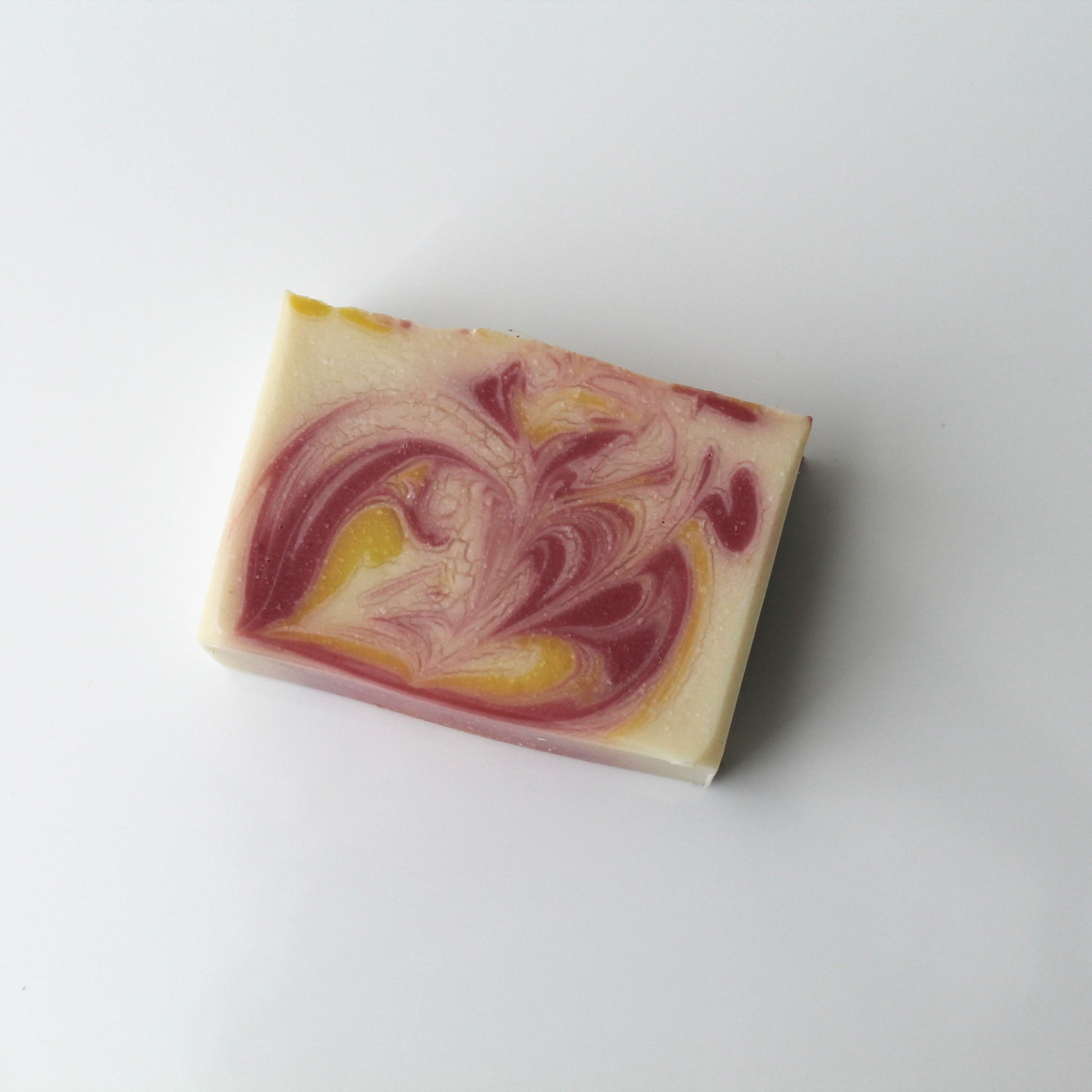 Black Raspberry Vanilla Soap is a tantalizing fusion of fruity delight and warm vanilla allure. Vibrant pink and yellow swirls create a visual feast that's as beautiful as it is luxurious.